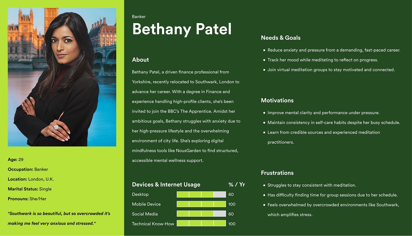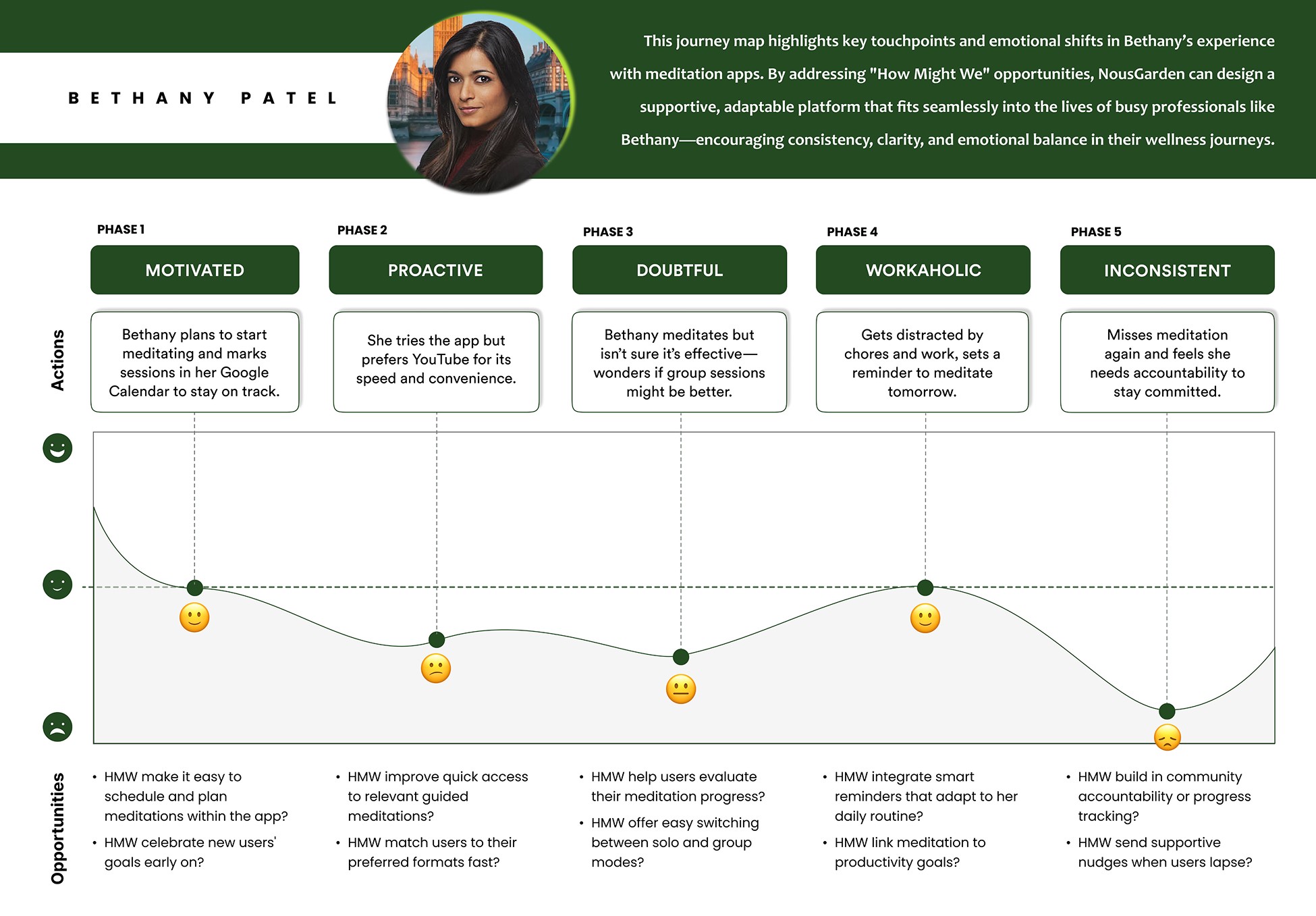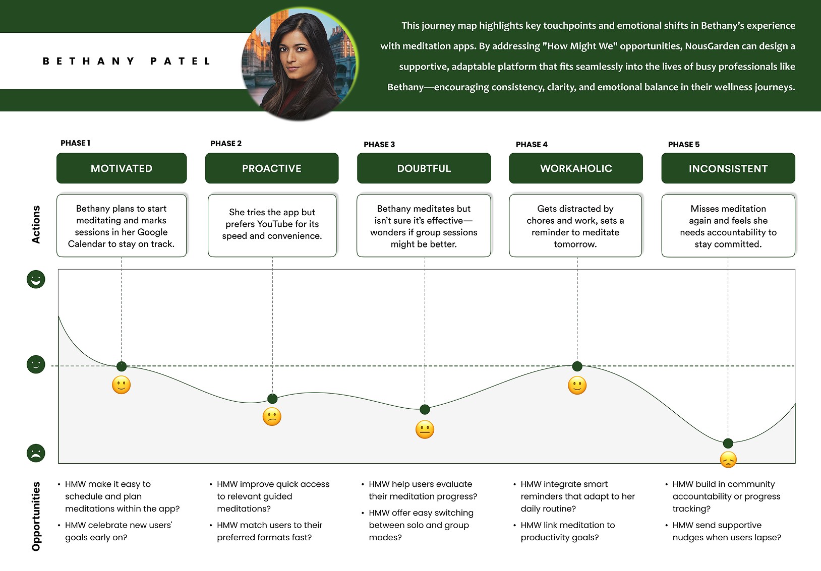 This journey map highlights key touchpoints and emotional shifts in Bethany’s experience with meditation apps. By addressing "How Might We" opportunities, NousGarden can design a supportive, adaptable platform that fits seamlessly into the lives of busy professionals like Bethany—encouraging consistency, clarity, and emotional balance in their wellness journeys.