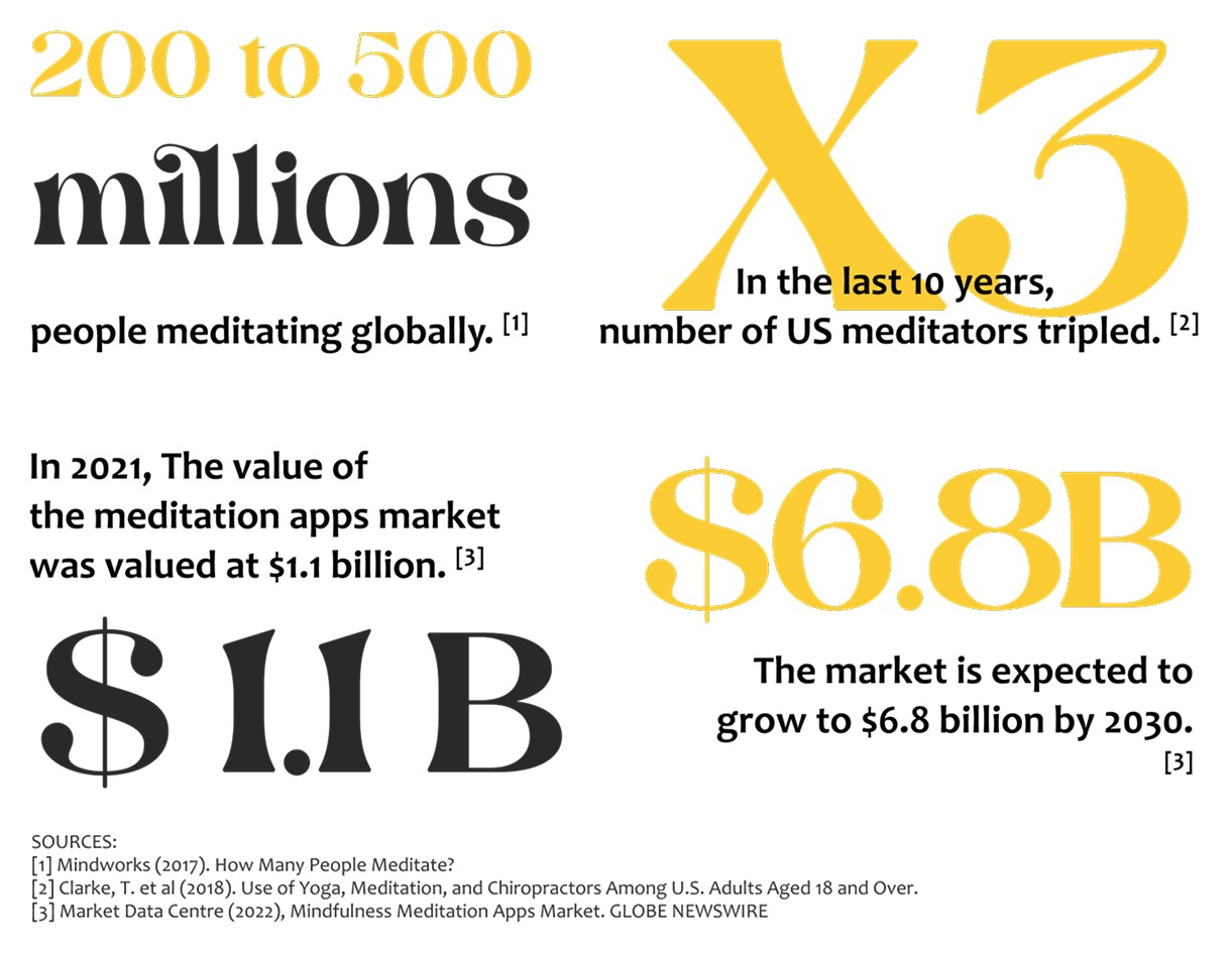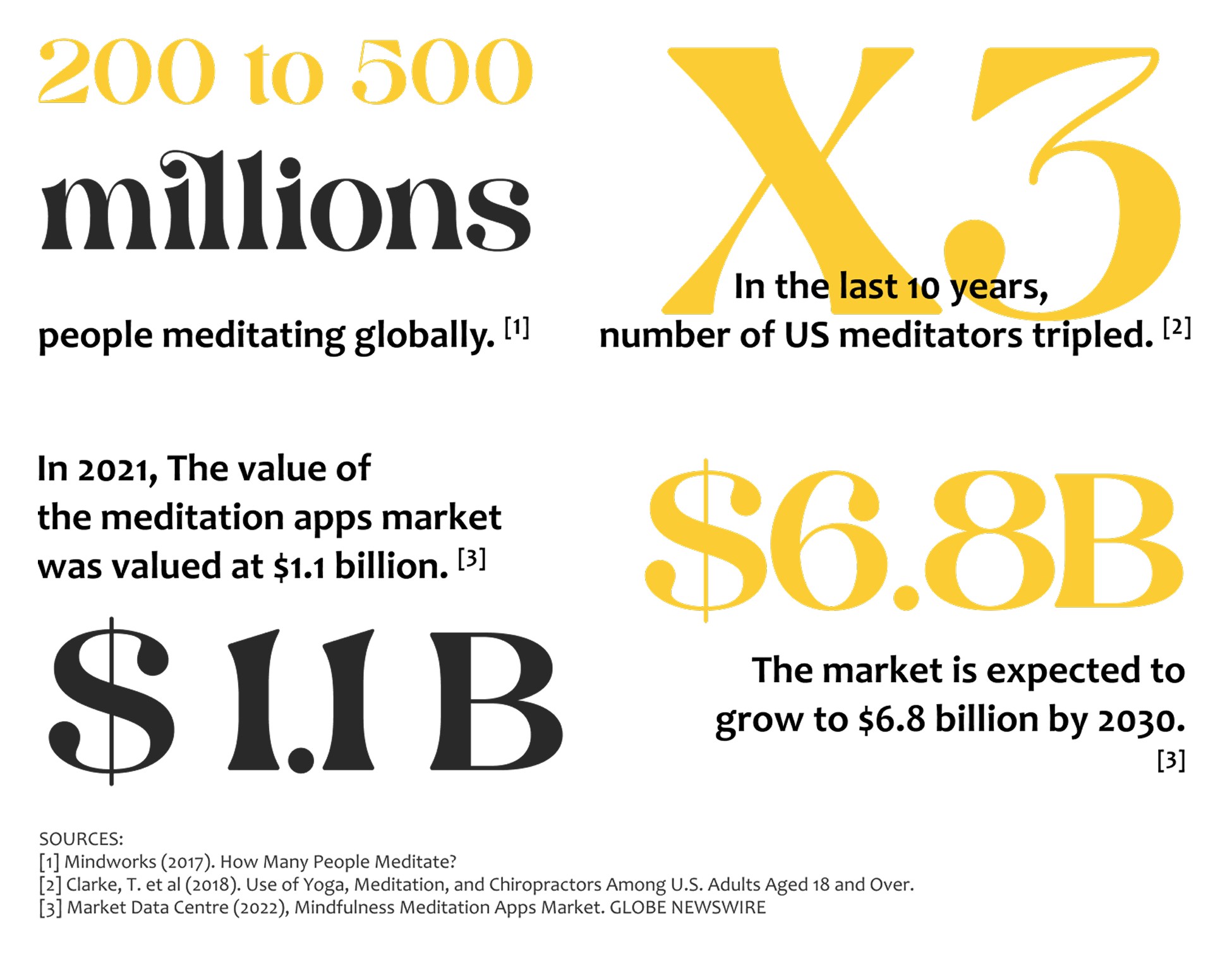 The global meditation market shows strong growth potential, with over 200 million people meditating worldwide and the number of US meditators tripling in the past decade. Valued at $1.1 billion in 2021, the market is expected to reach $6.8 billion by 2030, highlighting rising demand for innovative, mindfulness-based digital solutions.