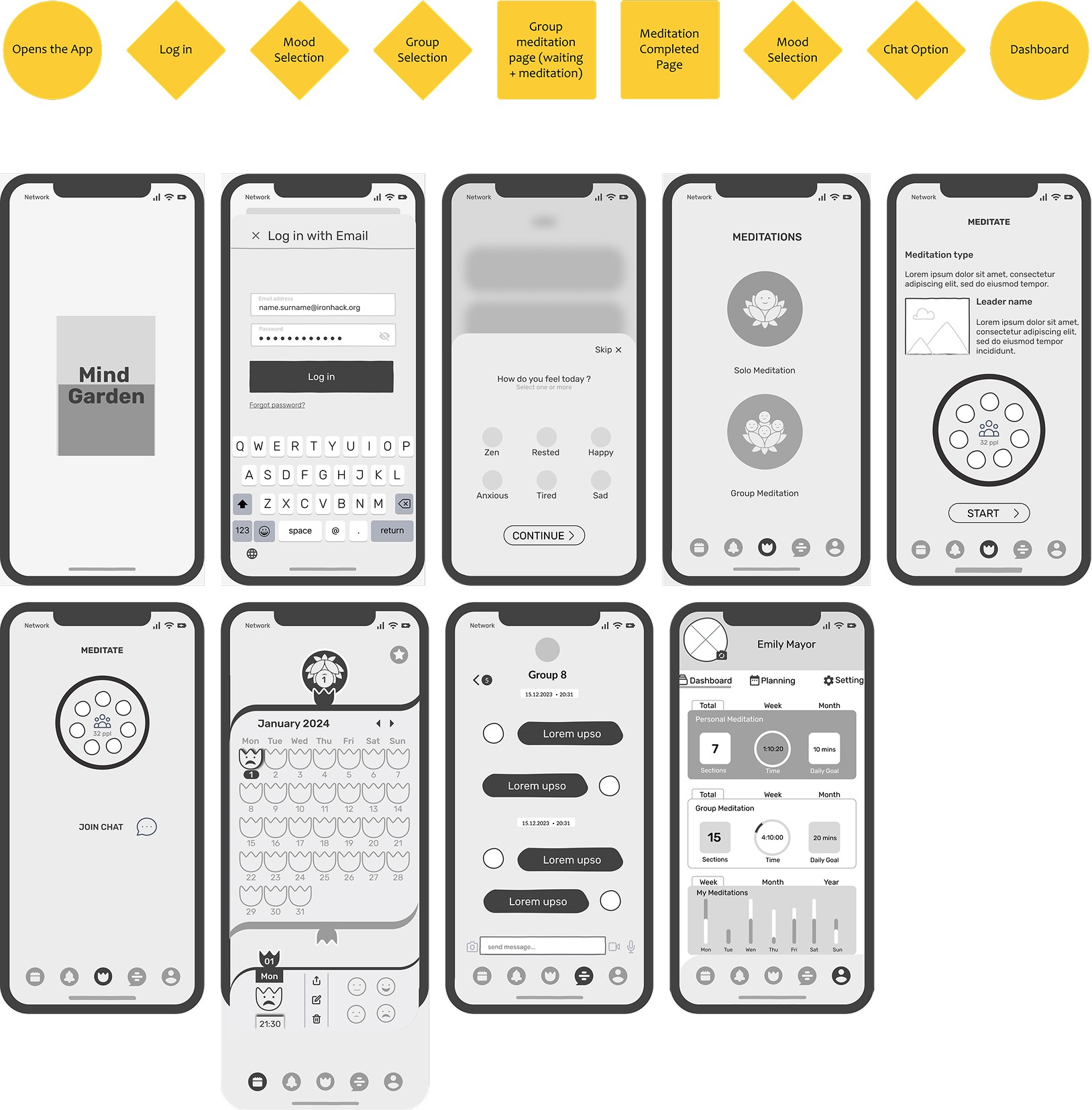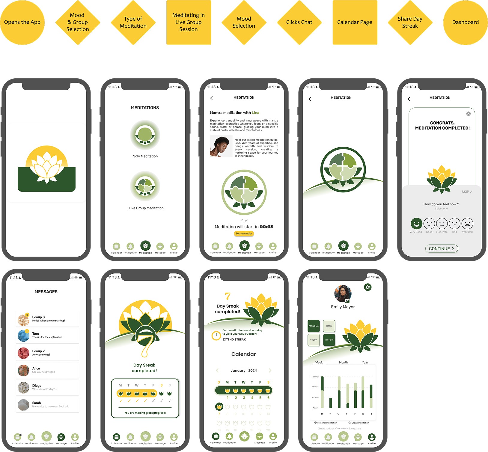 In a team, designed a mobile app that encourages group meditation to promote accountability and routine. The design helps users stay consistent, track their moods, and build long-term wellness habits.