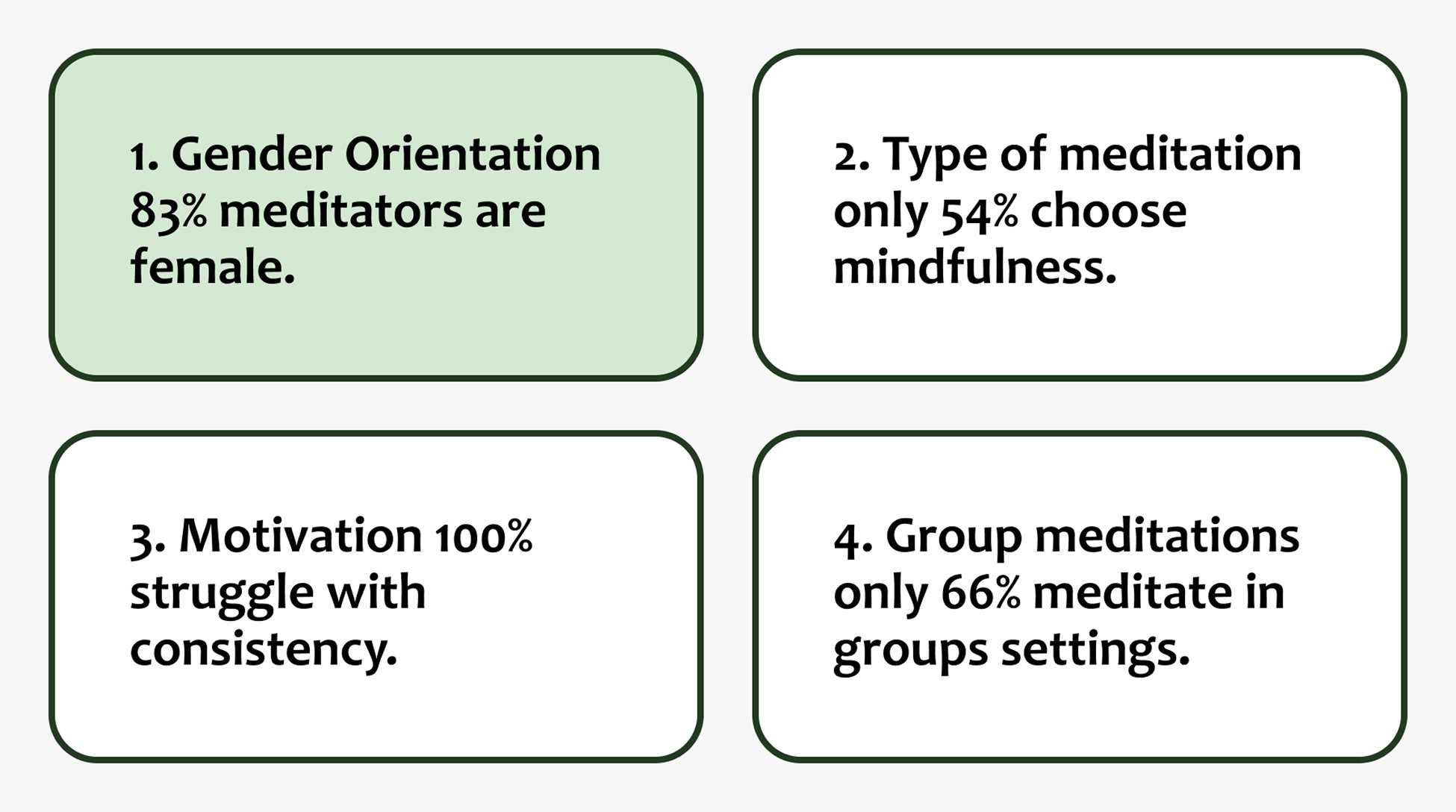 We conducted both qualitative and quantitative research through affinity mapping, we grouped user feedback into key themes that shaped four pain points. From 22 survey responses and 6 interviews, themes around gender, meditation types, consistency, and group practice emerged as the most significant insights.